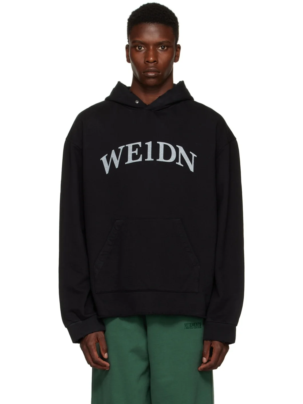 Cotton fleece hoodie. · Distressing at hood and rib knit cuffs · Logo printed at front · Kangaroo pocket · Rolled edge at hem · Rubberized logo patch at back hem Supplier color: Black Body: 100% cotton. Trim: 95% cotton, 5% polyurethane. Made in South Korea 222327M202023