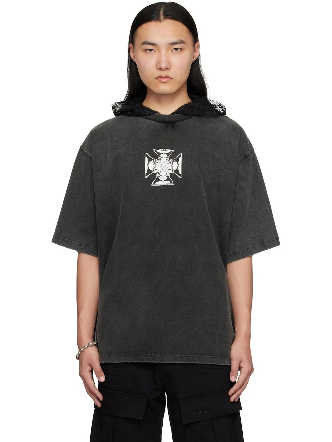 Cotton jersey T-shirt. Fading throughout · Embroidered sheer lace hood · Rib-knit crewneck · Subtle distressing at collar, hem, and cuffs · Logo graphic printed at chest · Dropped shoulders Supplier color: Black Body 1: 100% cotton. Body 2: 100% polyester. Made in South Korea 251327M202003