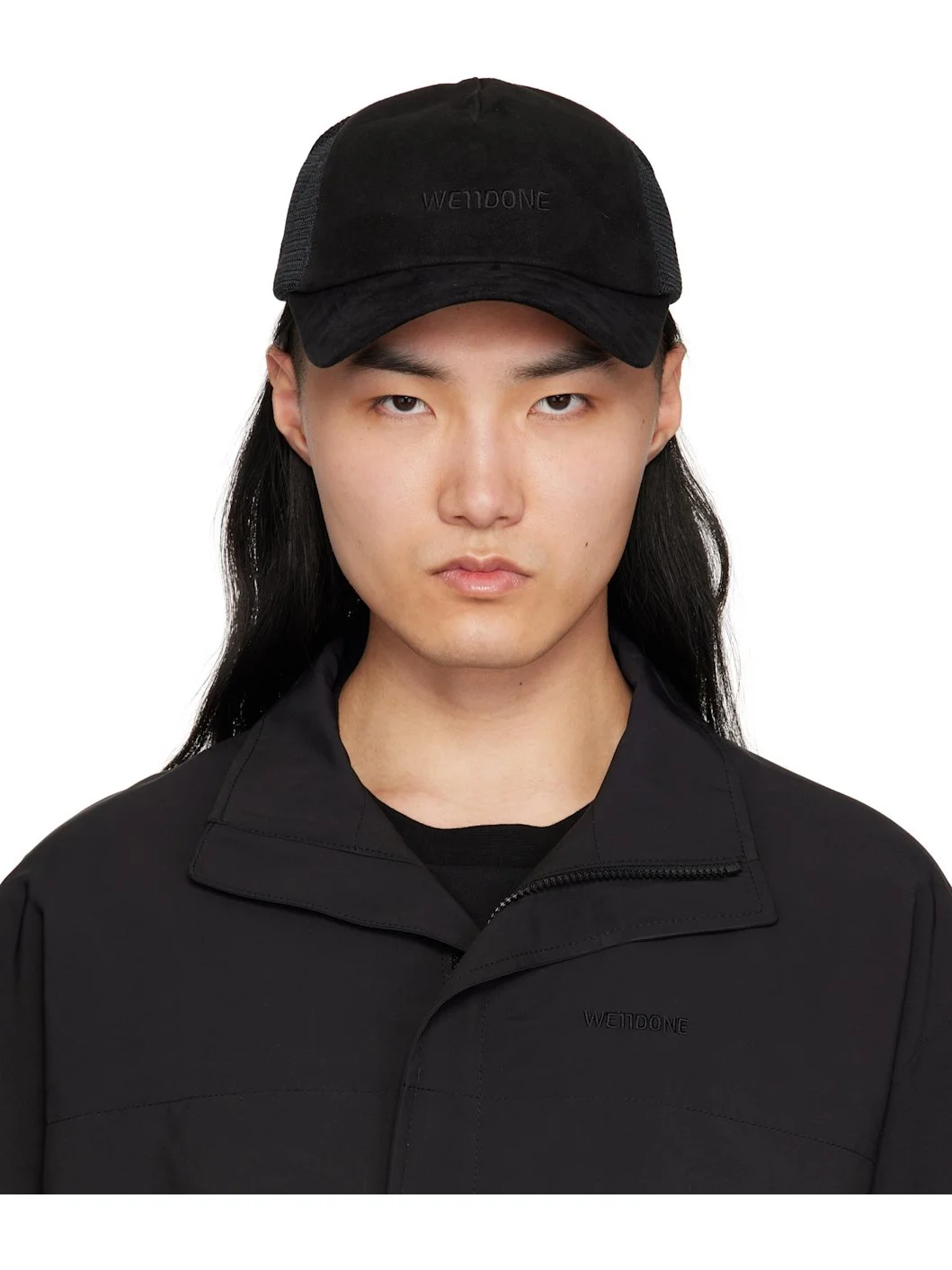 Goatskin suede and nylon mesh cap in black. · Logo embroidered at face · Curved brim · Cutout at back face · Snapback fastening · Partial cotton poplin lining Supplier color: Black Body 1: 100% goatskin. Body 2: 100% nylon. Lining: 100% cotton. Made in South Korea 251327M139001