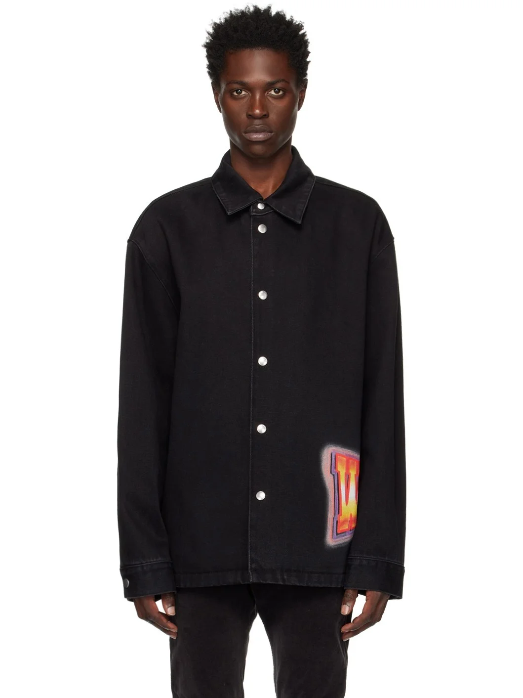 Non-stretch denim shirt. Fading throughout. · Spread collar · Button closure · Welt pockets at waist · Logo graphic printed at side seam · Single-button barrel cuffs · Twin pleats at back yoke Supplier color: Black 100% cotton. Made in South Korea 222327M192005