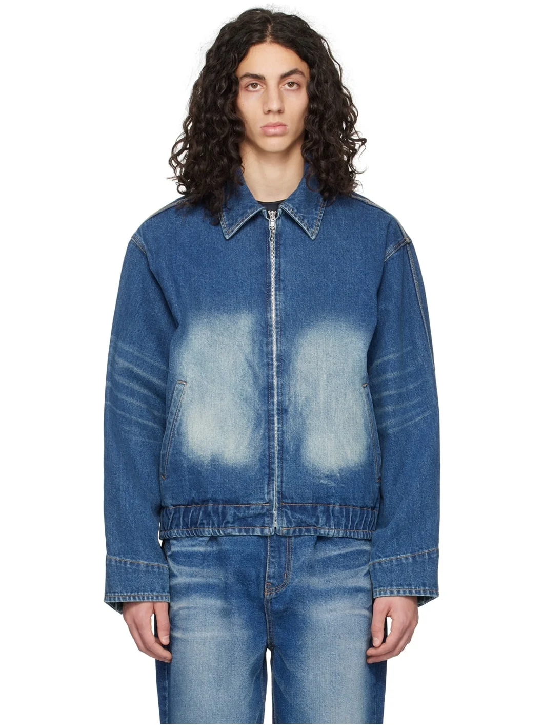Non-stretch denim jacket. Fading and whiskering throughout. · Spread collar · Zip closure · Welt pockets · Elasticized hem · Press-stud tab at cuffs · Frayed graphic patches at back · Contrast stitching in tan Supplier color: Blue 100% cotton. Made in South Korea 231327M177010