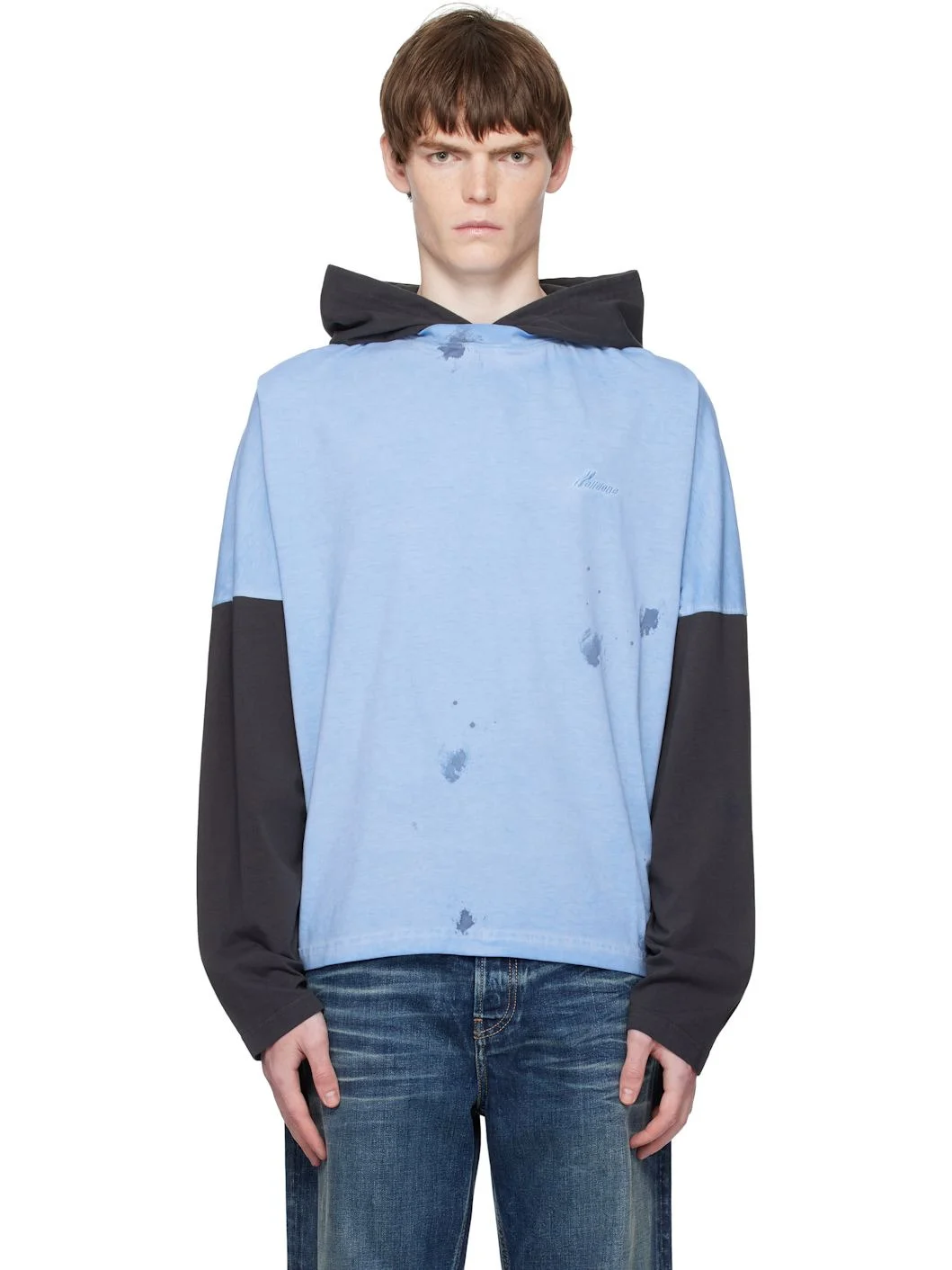 Cotton jersey hoodie. · Paint splatter pattern throughout · Logo embroidered at chest · Dropped shoulders · Paneled sleeves Supplier color: Blue Body: 100% cotton. Trim: 100% cotton. Made in South Korea 252327M202008