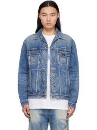 Non-stretch denim jacket. Fading, whiskering, and subtle distressing throughout. · Spread collar · Button closure · Logo embroidered at chest · Flap and welt pockets · Single-button barrel cuffs · Button tabs at back hem · Logo-engraved antiqued gold-tone hardware · Contrast stitching in beige Supplier color: Blue 100% cotton. Made in South Korea 251327M177000