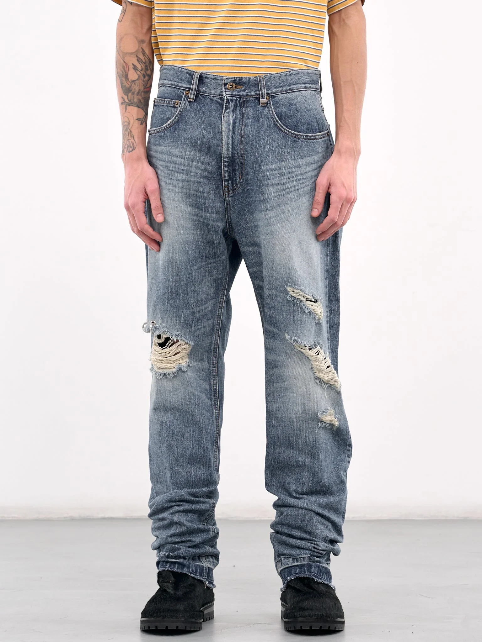 WE11DONE jeans in blue, paneled denim construction, medium wash, fading & whiskering, distressing throughout, belt loops & silver-tone hardware, back logo patch, front button & concealed zip fly closure, inset pockets, coin pocket, back patch pockets, tapered leg, slim fit. Made in South Korea 100% Cotton Standard Sizing Model is 6'1” and wears a size M. Shoulders: 17” Chest: 33” Waist: 30”