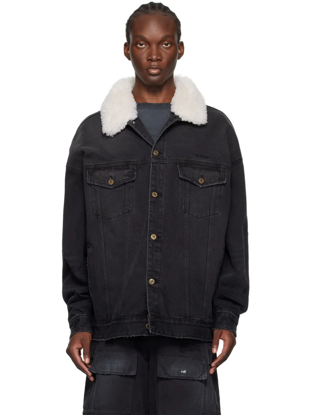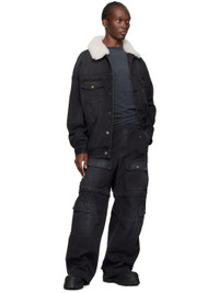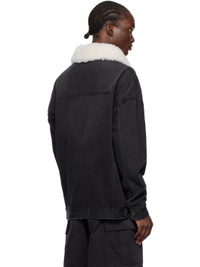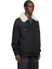 Non-stretch denim jacket. Fading throughout. · Sherpa fleece spread collar · Button closure · Logo embroidered at chest · Flap and welt pockets · Single-button barrel cuffs · Button tabs at back hem Supplier color: Black Body: 72% cotton, 26% polyester, 2% regenerated cellulose fibre. Trijm: 100% wool. Made in South Korea 242327M179000