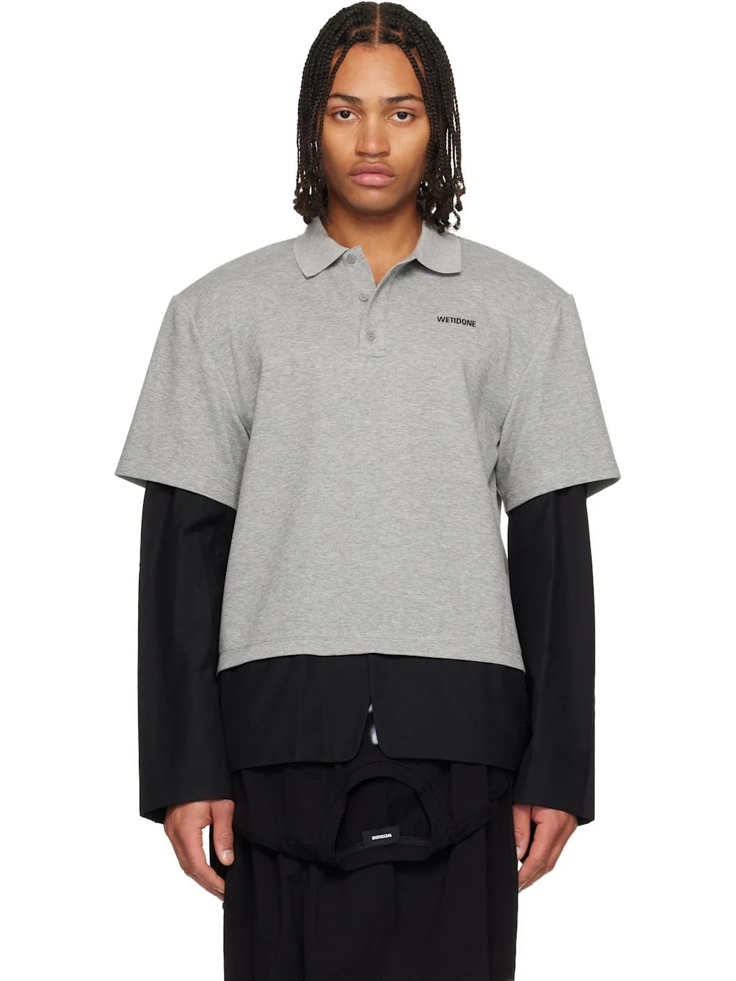 Stretch cotton-blend jersey and twill polo. · Layered construction · Rib-knit spread collar · Three-button placket · Logo embroidered at chest · Vent at front and back hem · Padded shoulders · Integrated layered long sleeves · Surgeon's cuffs Supplier color: Grey Body 1: 62% polyester, 34% cotton, 4% polyurethane. Body 2: 67% polyester, 23% rayon, 10% wool. Trim: 50% viscose, 50% polyester. Made in South Korea 252327M212000