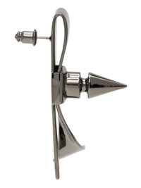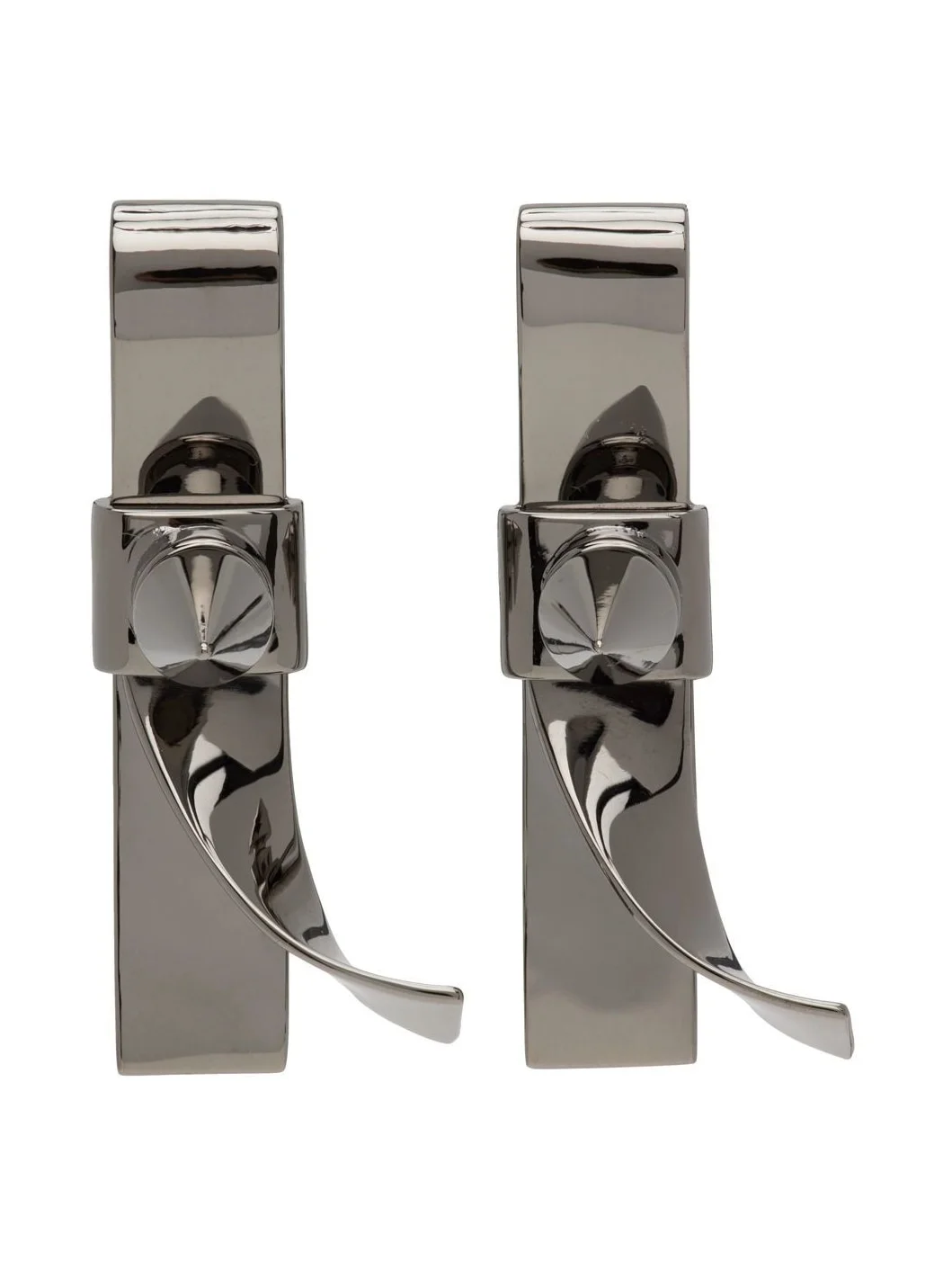 Pair of drop earrings in gunmetal-tone brass. · Graphic hardware at face · Logo engraved at back face · Post-stud fastening · H2 x W0.25 in Supplier color: Dark grey Brass. Made in South Korea 221327M144002