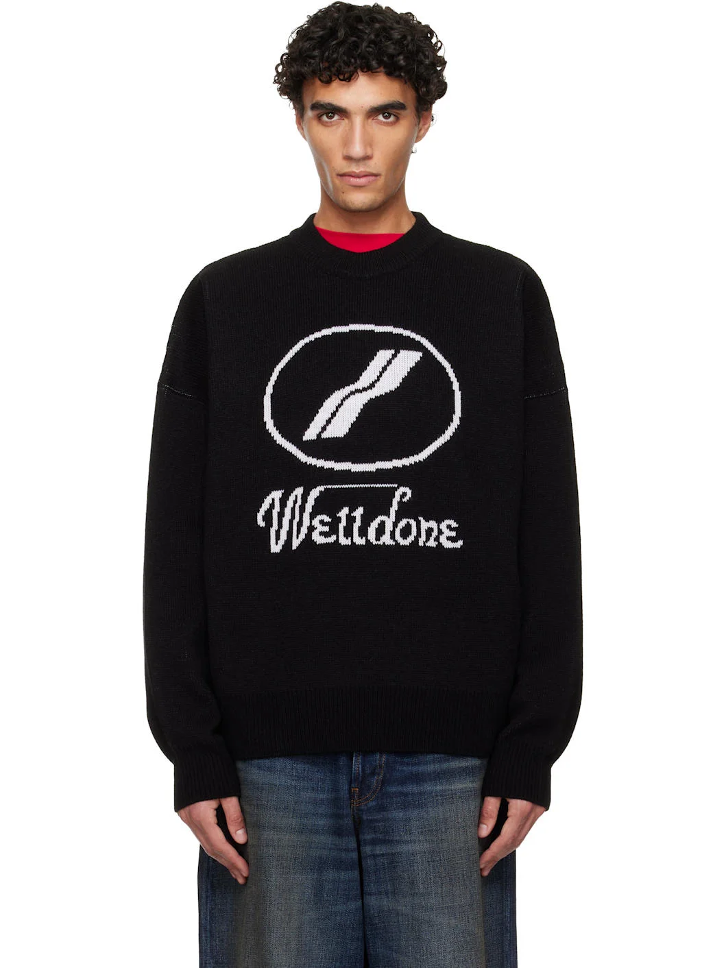 Knit wool-blend sweater. · Rib-knit crewneck, hem, and cuffs · Jacquard logo at chest · Dropped shoulders · Rubber logo at back hem Supplier color: Black 73% acrylic, 27% wool. Made in South Korea 261327M201008