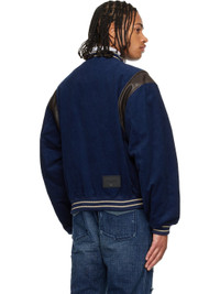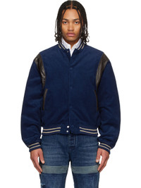Padded cotton corduroy bomber jacket. · Striped rib-knit stand collar, hem, and cuffs · Press-stud closure · Welt pockets at waist · Grained lambskin trim at pockets and armscyes · Rubberized logo patch with piercing at back · Welt pockets at interior · Full satin lining Supplier color: Navy Body: 100% cotton. Trim: 100% lambskin. Fill: 100% polyester. Lining: 100% polyester. Made in South Korea 252327M181002