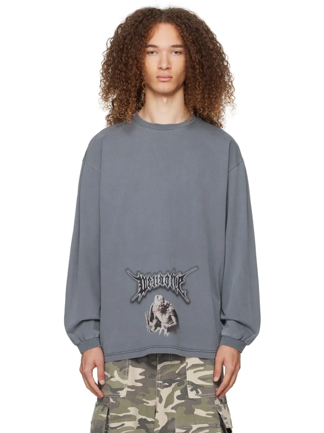 Cotton jersey T-shirt. Fading throughout. · Rib knit crewneck and cuffs · Logo graphic printed at front · Dropped shoulders · Logo printed at back hem Supplier color: Navy Body: 100% cotton. Trim: 96% cotton, 4% polyurethane. Made in South Korea 241327M213048
