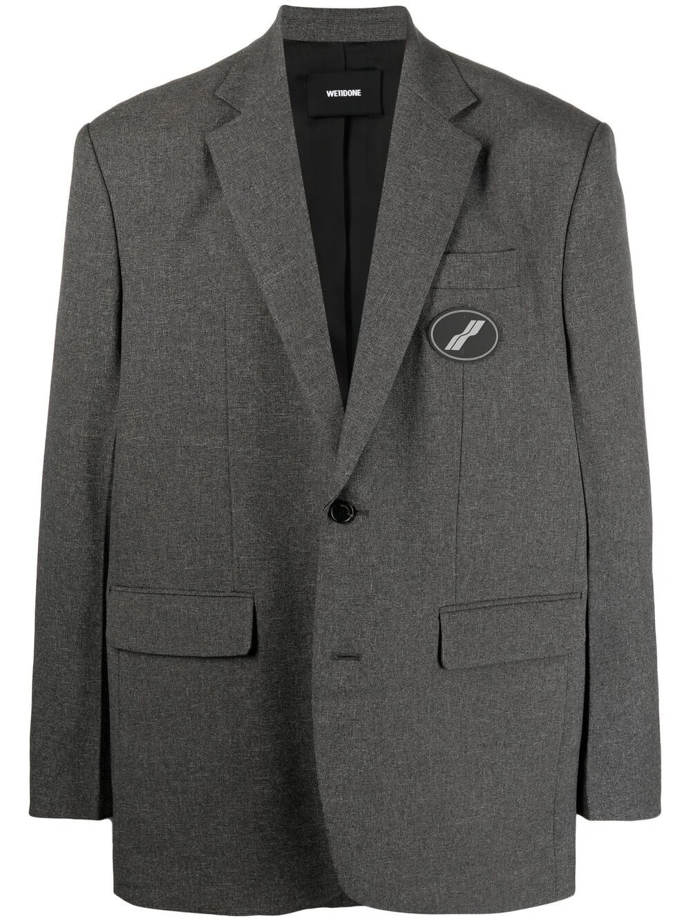 notched-lapels single-breasted blazer charcoal grey logo patch to the front notched lapels front button fastening long sleeves buttoned cuffs chest welt pocket two chest flap pockets English rear vents satin lining Imported Composition Outer: Polyester 65%, Rayon 32%, Polyurethane 3% Lining: Rayon 100% SIZE & FIT Model measurements Height 6 ft 1 in(1.85 m) Bust/Chest 35.82 in(91 cm) Hips 37.79 in(96 cm) Waist 29.13 in(74 cm) FittingInformation This piece fits true to size. We recommend you get your regular size Cut for a loose fit Made with a mid-weight non-stretch fabric Measurement CHEST 46.45 in(118 cm) SLEEVE LENGTH 24.8 in(63 cm) Shoulder Width 19.68 in(50 cm) WAIST 44.09 in(112 cm) Washing instructions Dry Clean Only