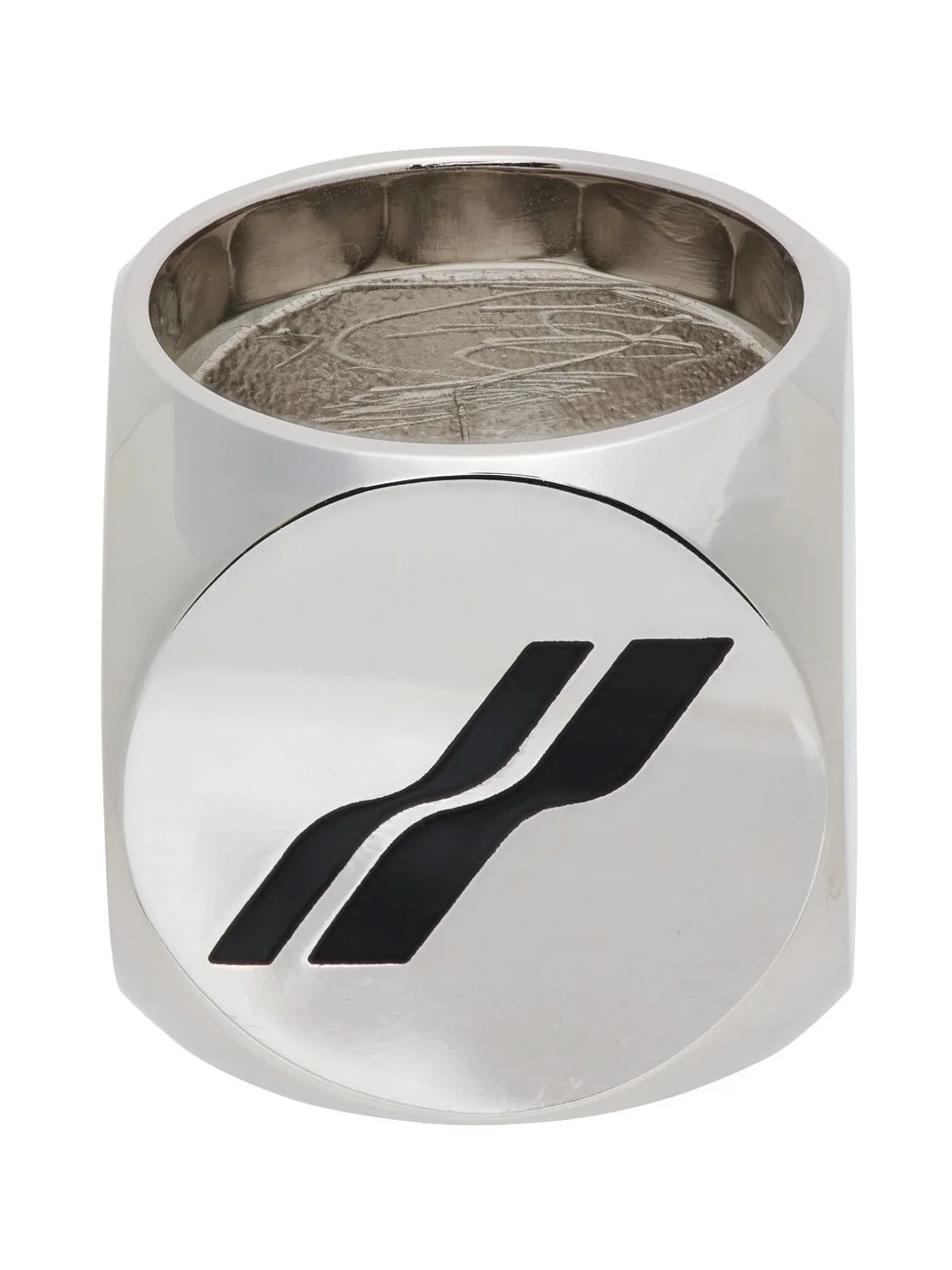 Graphic band ring in silver-tone brass. Logo in black at face. Supplier color: Black Brass. Made in South Korea 221327M147002
