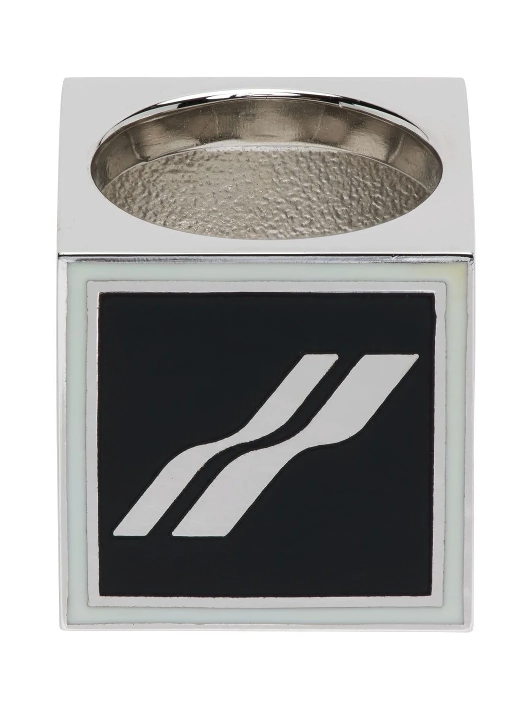 Graphic band ring in silver-tone brass. Logo in black and white at face. Supplier color: Black/White Brass. Made in South Korea 221327M147001