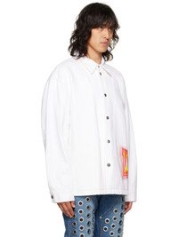 Paneled non-stretch denim jacket. · Spread collar · Button closure · Logo graphic printed at side seam · Seam pockets · Dropped shoulders · Single button barrel cuffs · Pleats at back yoke · Adjustable buttoned tabs at back hem · Unlined · Logo-engraved silver-tone hardware Supplier color: White 100% cotton. Made in South Korea 222327M192007
