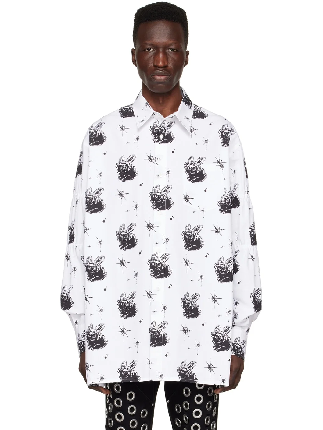 Cotton poplin shirt. Graphic pattern printed throughout. · Spread collar · Button closure · Patch pocket · Shirring at sleeves · Single-button barrel cuffs · Gathering at back yoke Supplier color: White 100% cotton. Made in South Korea 221327M192009