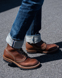 8" Wesco® Jobmaster boots, in a distinctive brown Maryam horsehide with a Vibram® #100 sole and brass hardware. Built to the high spec standard we've come to expect from the masters at Wesco®. Made by Wesco® Boots Traditional work and engineer boots from the USA, handcrafted in Scapposse, Oregon. Wesco® Jobmaster® (IHWE-JMHH-BRN) - Features & Construction - Iron Heart International x Wesco® collaboration - 8" lace up boot - Brown Maryam horsehide - Regular toe - #100 Vibram sole - Waxed edges - Brass hooks and eyelets - Lightweight sterling upper stitching - Khaki heavy upper stitching - White Nylon outsole stitching - Leather inserts - Brown Horsehide Kilties included Maryam Horsehide - Maryam horsehides are sourced from the highly regarded Maryam Tannery, vegetable-tanning specialists based in Tuscany, Italy - Horsehide is a dense, durable leather known for its toughness, wind resistance, and ability to break in over time without losing structural integrity. Compared to cowhide, it has a tighter grain and firmer feel, making it well-suited to outerwear like motorcycle and workwear jackets - Over time, horsehide will develop character through creasing, darkening, and subtle patina. Unlike Shell Cordovan, it has a more textured surface and is less prone to fine scratching, though sharp abrasives can still scuff or gouge the finish - Horsehide is typically treated during tanning with oils and waxes, giving it a degree of water resistance. We recommend conditioning only when the leather shows signs of dryness — about once or twice a year, depending on wear and climate. Use a neutral leather conditioner or balm sparingly, applying a small amount and buffing thoroughly. Avoid over-conditioning, as it can soften the leather excessively and affect its structured shape - For cleaning, start with a soft, dry cloth to remove surface dust. For more thorough cleaning, use a slightly damp cloth with a drop of mild soap, and gently wipe down the jacket. Never soak the leather. If the jacket gets wet, blot gently and allow it to naturally dry at room temperature, away from heat sources. Once dry, a light buff with a soft cloth will restore its finish