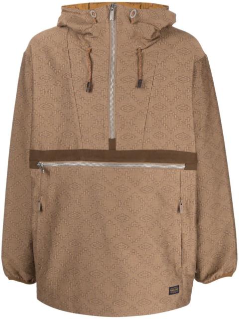 geometric pattern half-zipped jacket brown cotton blend geometric-pattern print ribbed detailing half front zip fastening zip detail two side zip-fastening pockets logo patch to the side side button fastening drawstring hood long sleeves buttoned cuffs Imported Composition Cotton 74%, Polyester 26% SIZE & FIT Model measurements Height 6 ft 3 in(1.9 m) Bust/Chest 34.64 in(88 cm) Hips 36.61 in(93 cm) Waist 27.55 in(70 cm) FittingInformation This piece fits true to size. We recommend you get your regular size Cut for a loose fit Made with a mid-weight non-stretch fabric Washing instructions Dry Clean Only