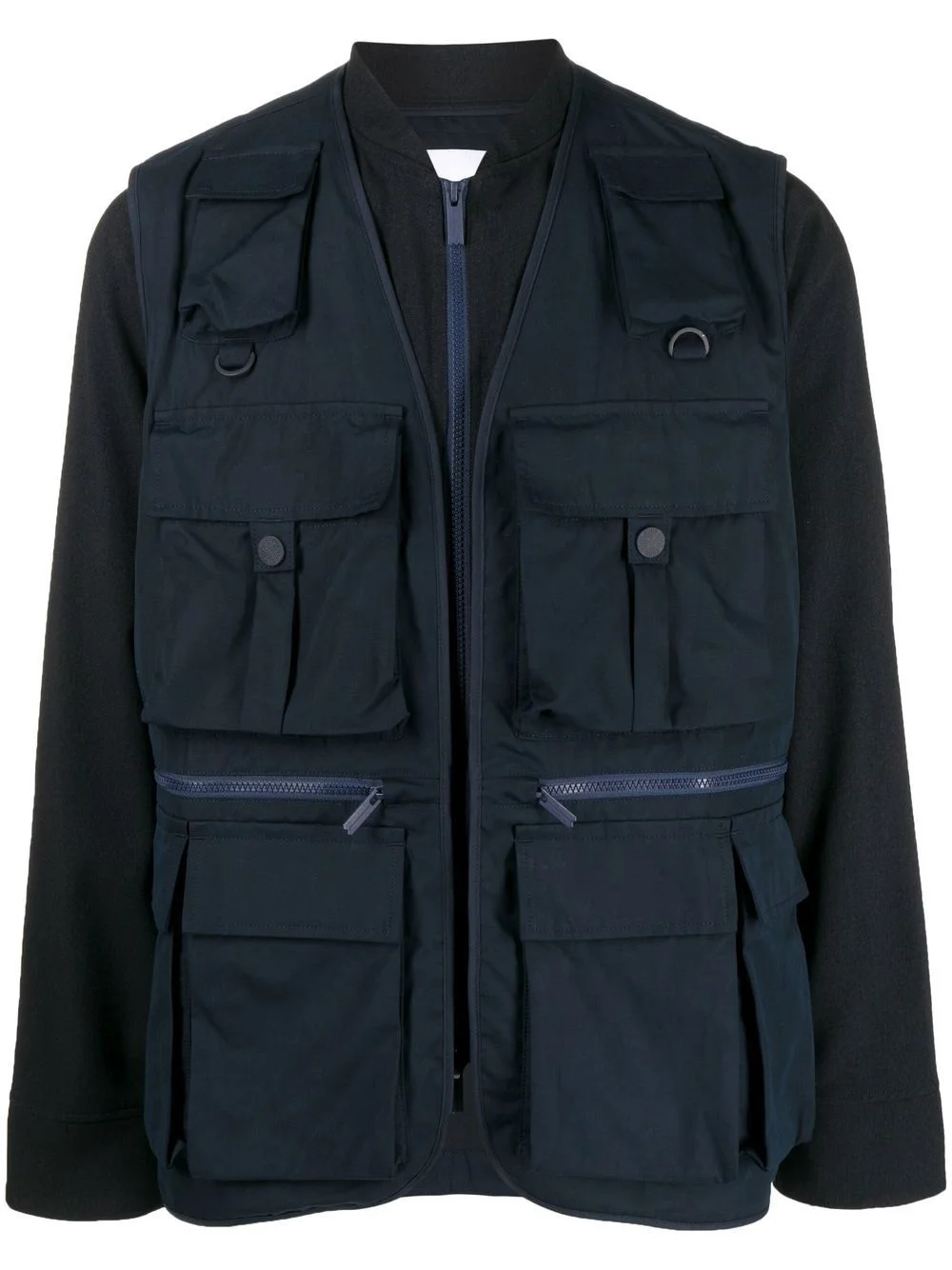 multi-pocket fishing jacket navy blue multiple cargo pockets stand-up collar front zip fastening long sleeves Imported Composition Polyester 59%, Cotton 41% SIZE & FIT Model measurements Height 6 ft 0 in(1.84 m) Bust/Chest 35.43 in(90 cm) Hips 35.82 in(91 cm) Waist 28.74 in(73 cm) FittingInformation This piece fits true to size. We recommend you get your regular size Cut for a loose fit Made with a mid-weight non-stretch fabric Washing instructions Hand Wash