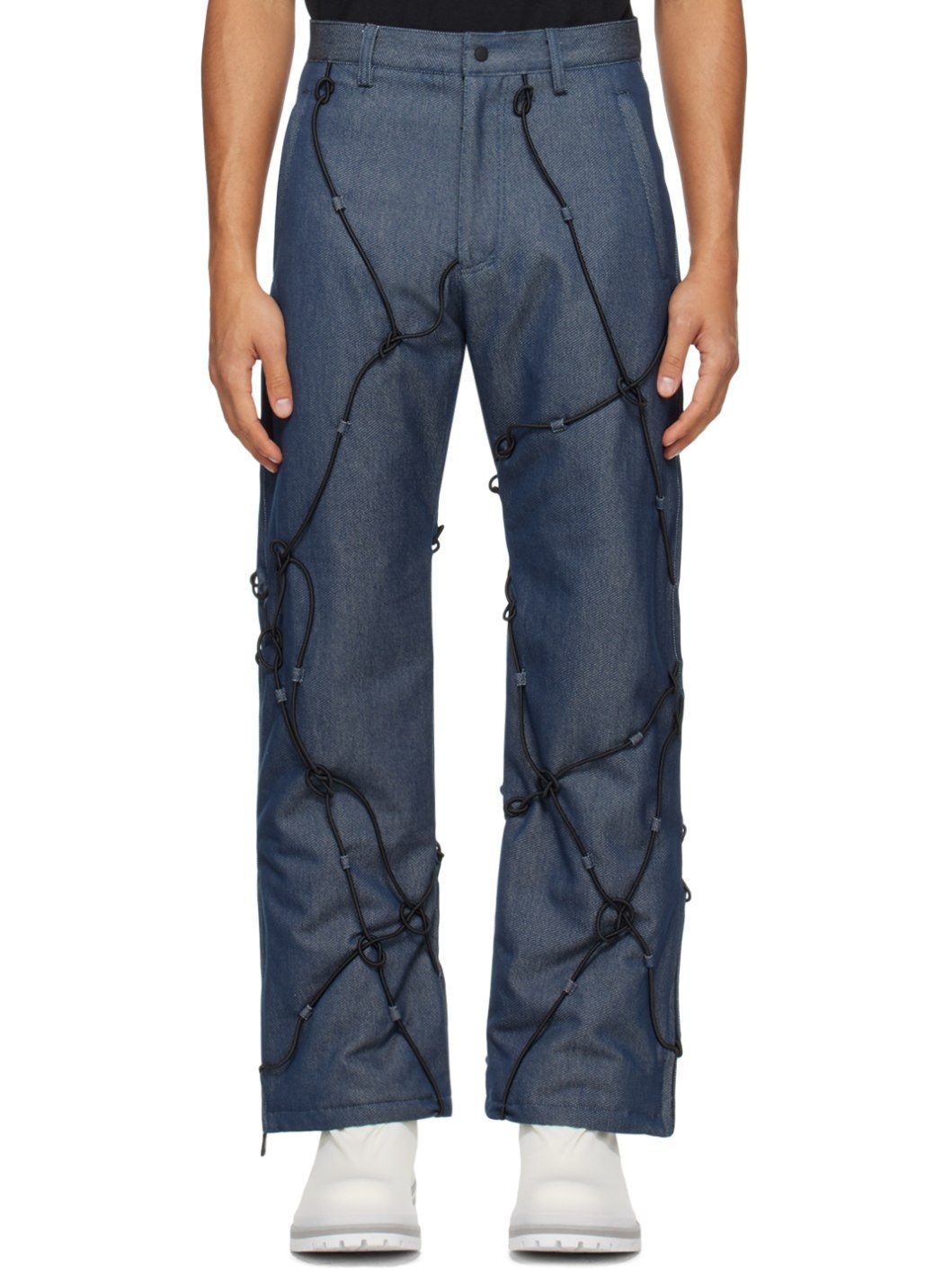 Insulated non-stretch denim trousers. Elasticized strap detailing and knotted accents throughout. · Belt loops · Four-pocket styling · Zip-fly · Inset elasticized cuffs · Zip vent at cuffs · Logo patch at back pocket · Full lacquered nylon taffeta lining · Logo-engraved black hardware Part of the Who Decides War x add collaboration. Supplier color: Blue