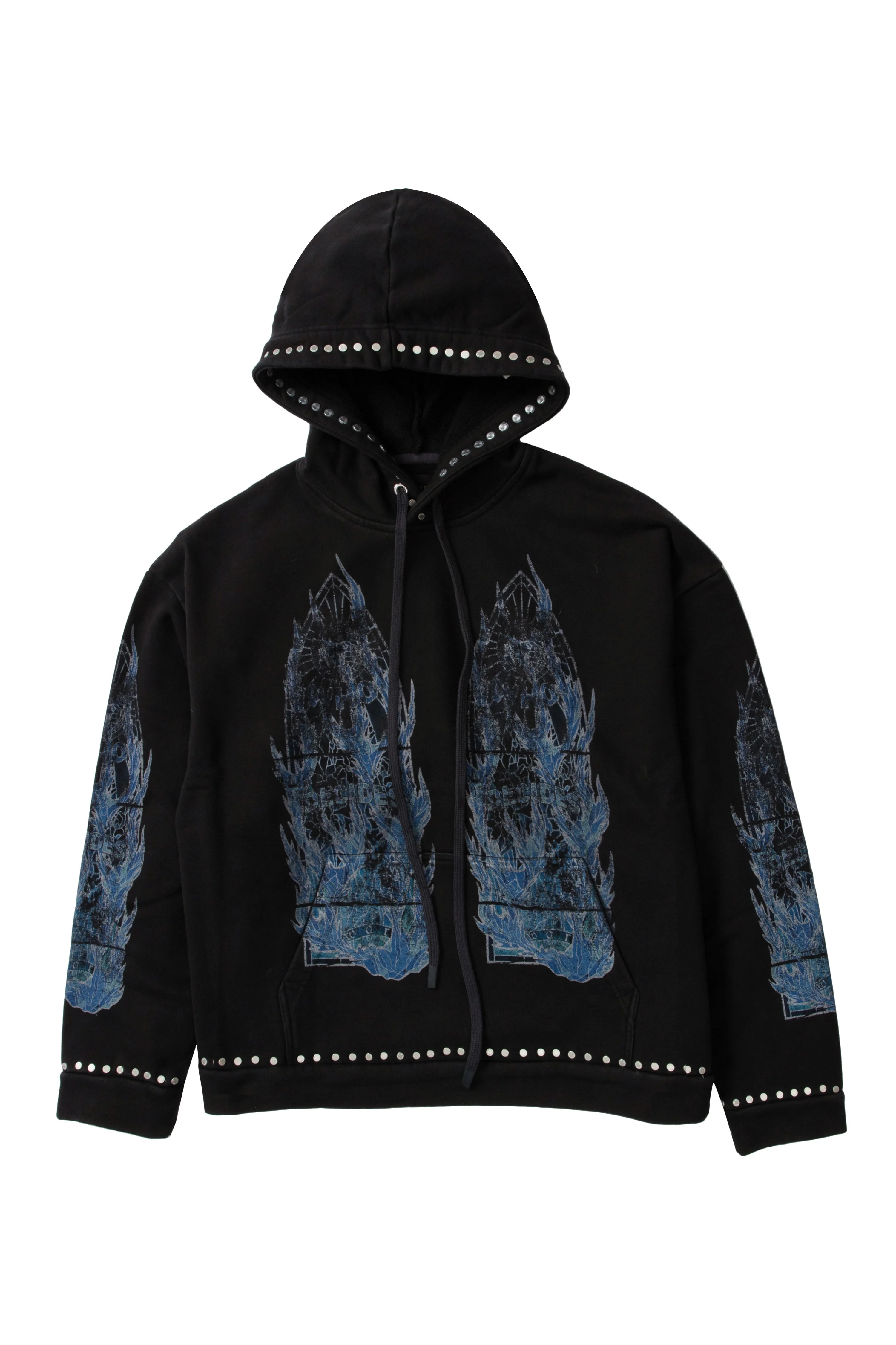 The Flame Glass Hooded Pullover is constructed from 100% cotton. Featuring faded screen printed flame glass motifs, studded accents throughout and a boxy, slightly cropped fit. Following your normal size is recommended. Processing takes 1-2 days, shipping in the US 3-4 days, internationally 7-10 days.
