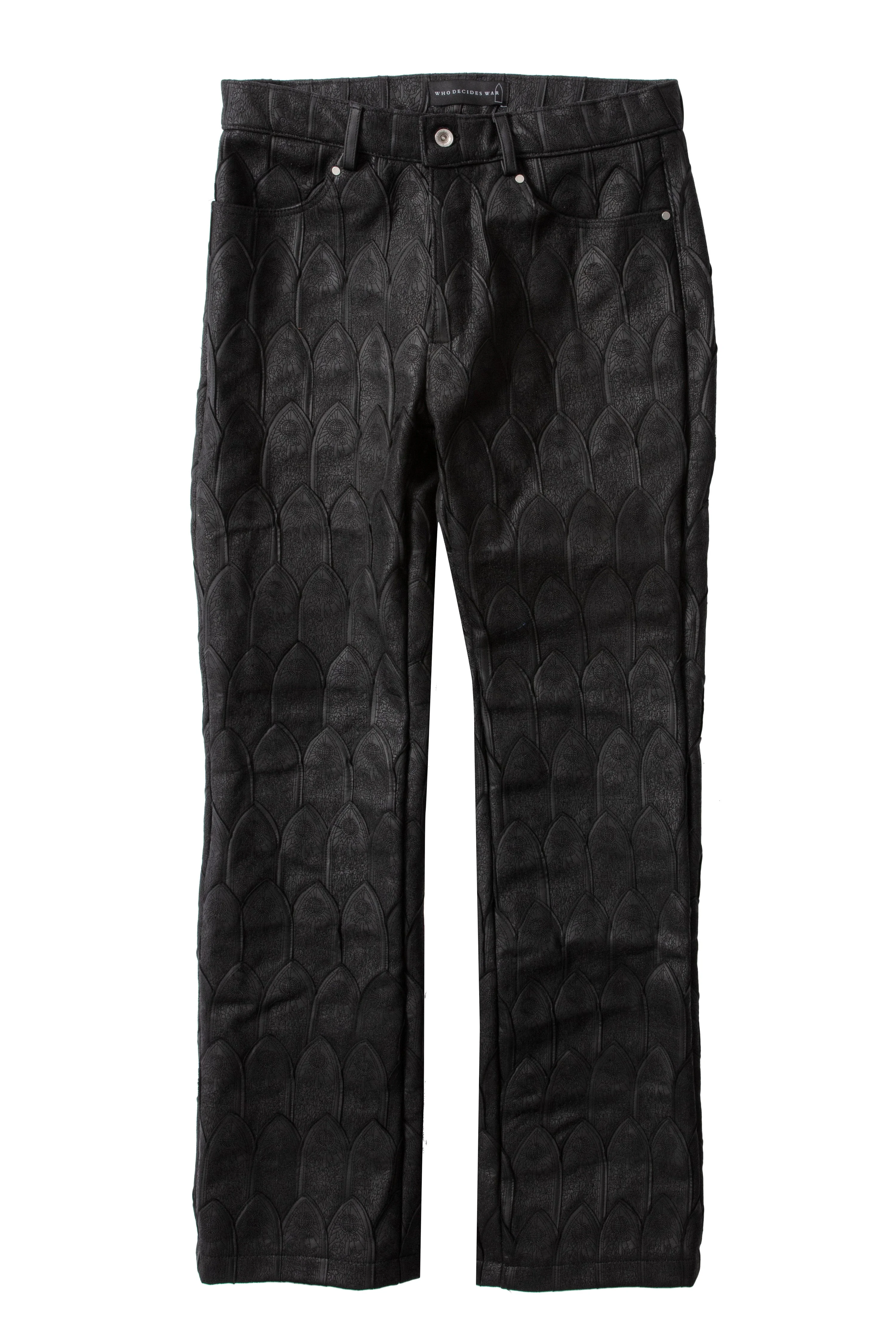 The Flooded Arc Trousers are constructed from 100% genuine cowhide. Embellished with embroidered stained glass patches and stacked to emulate scales throughout. With intentional design placement this adds a distinctive touch. The pants inseam sit at 35.5 inches, following your normal size is recommended. Processing takes 1-2 days, shipping in the US 3-4 days, internationally 7-10 days.
