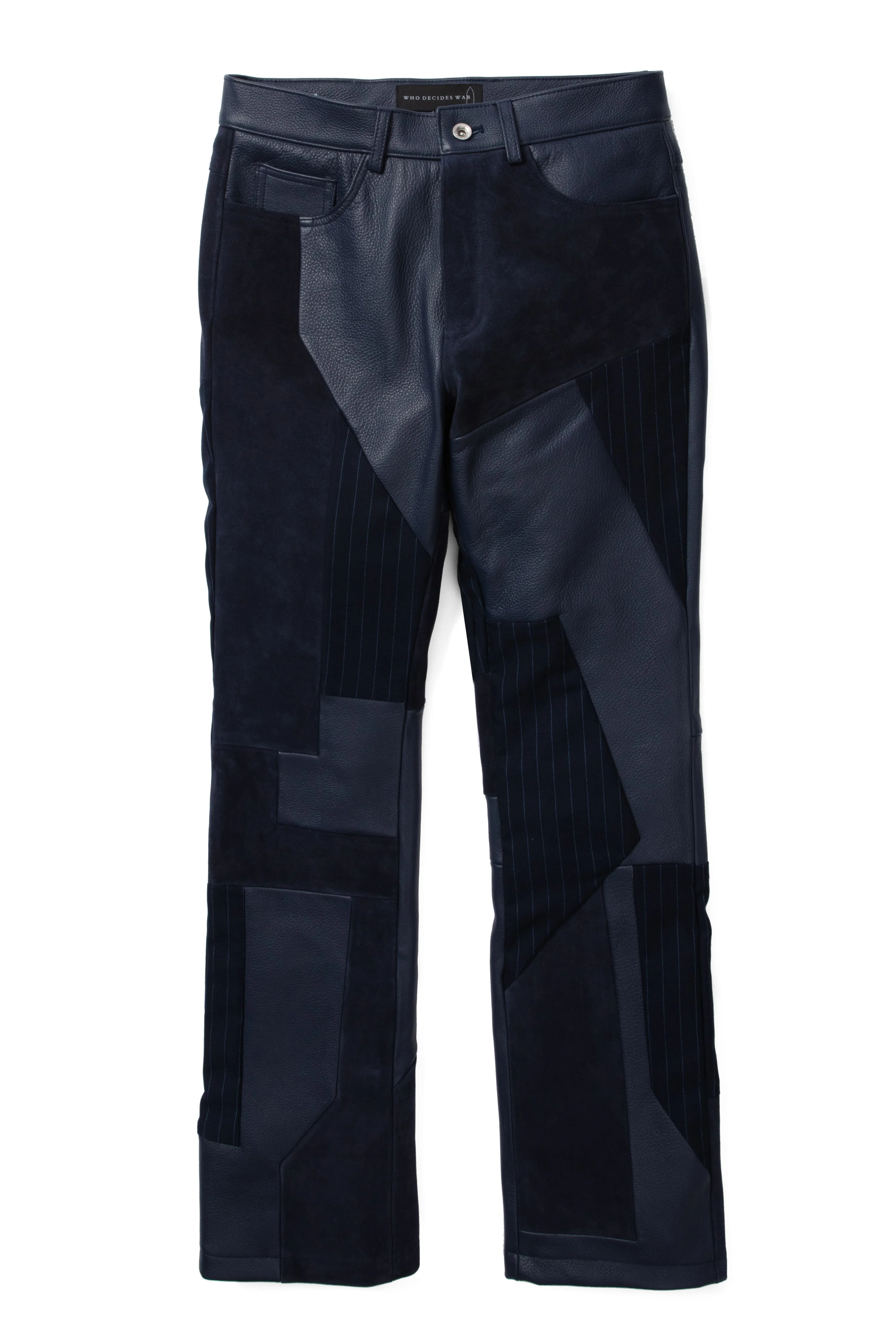 The Fragmented Leather Trousers are a leather/wool/suede blend, straight fit with 35.5" inseam, patchwork throughout. Follow your normal size. Processing takes 1-2 days, shipping in the US 3-4 days, internationally 7-10 days.