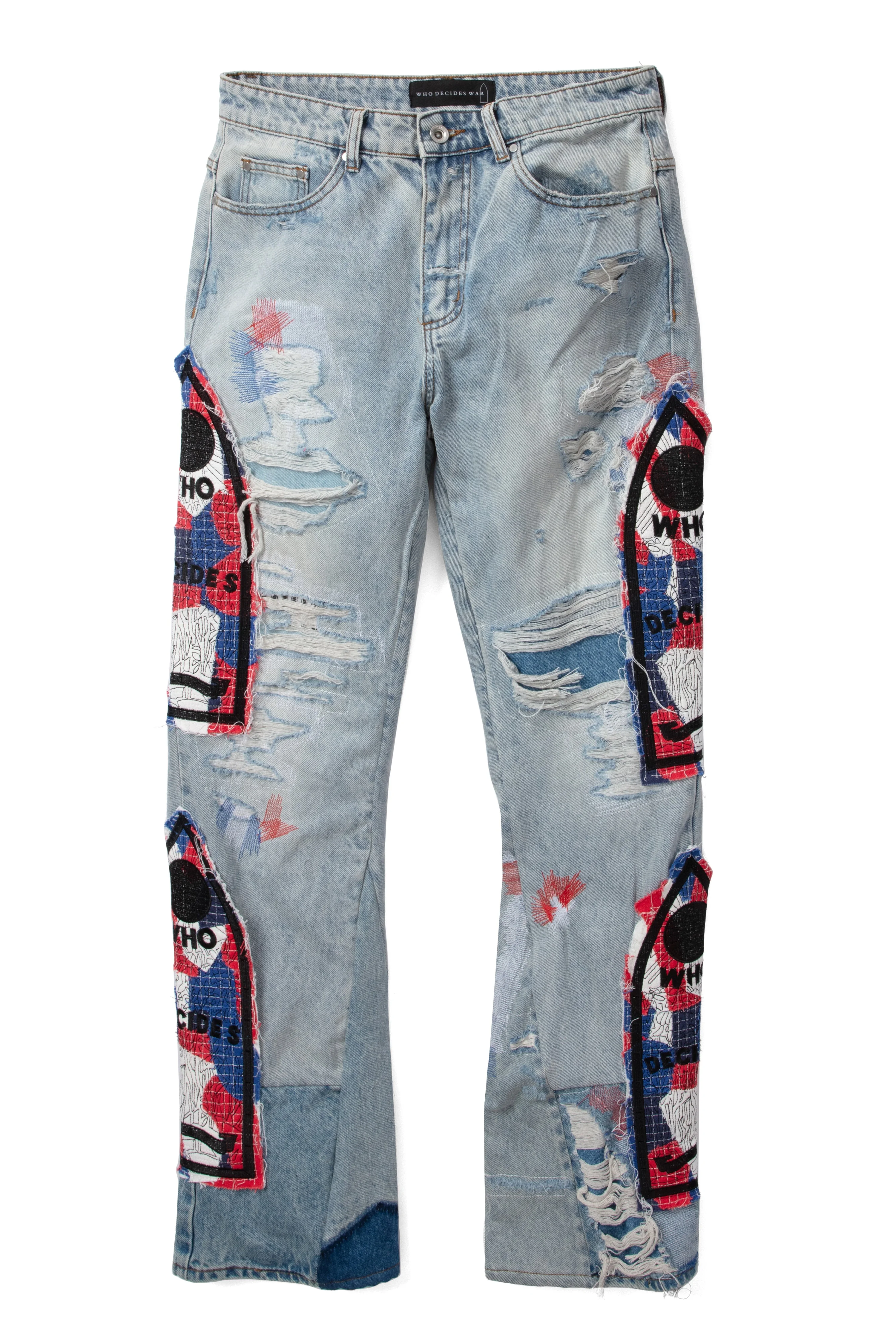 The Glory Denim are comprised of 100% cotton and feature a flared cut. The pants feature an inseam of 35.5 inches and are embellished with embroidered patches, distressing and darning throughout. Follow your normal size. Processing takes 1-2 days, shipping in the US 3-4 days, internationally 7-10 days.