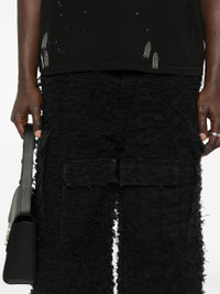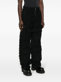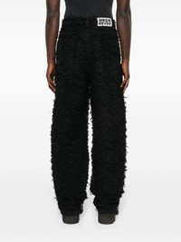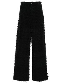 black cotton distressed finish fringe detailing ripped detailing belt loops two side inset pockets multiple front flap pockets wide leg concealed fly and button fastening Size & Fit Model Measurements: Height: 1.84 m Bust/Chest: 90.0 cm Hips: 96.0 cm Waist: 72.0 cm Model wears size 32 Fabric and Care Designer Style ID: HUSKWIDELEGPANT Designer Colour: COAL Composition: Cotton 100% Washing instructions: Machine Wash