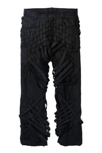 The Interwoven Trousers are comprised of 100% cotton and feature a straight fit with 35.5" inseam, and an intricately intertwined woven denim strap pattern throughout. Follow your normal size. Processing takes 1-2 days, shipping in the US 3-4 days, internationally 7-10 days.