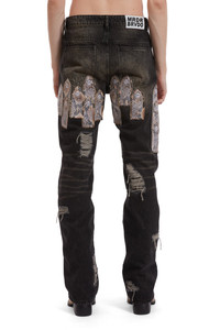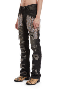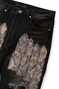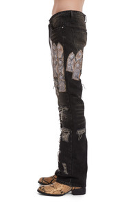 The Patch Arch Mocha Denim pants are made of 100% cotton, with a slim straight fit and 35.5-inch inseam. They feature patched distressing, a vintage wash, and real snakeskin mini stained-glass patches stacked on the front and back of both thighs. The wash is intended to make the pants look vintage and worn. Following your regular size is recommended. Processing takes 1-2 days, shipping in the US 3-4 days, internationally 7-10 days.