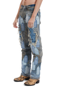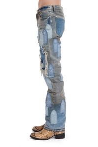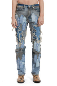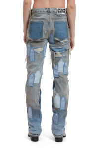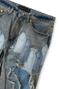 The Patched Arch Repaired Blowout Denim are comprised of 100% cotton and feature a slim straight fit. They have an inseam of 35.5 inches and are embellished with patched distressing, a vintage wash, and original mini stained glass tonal patches throughout the garment. The wash is intended to emulate a vintage worn and worked-in effect. Follow your normal size. Processing takes 1-2 days, shipping in the US 3-4 days, internationally 7-10 days.