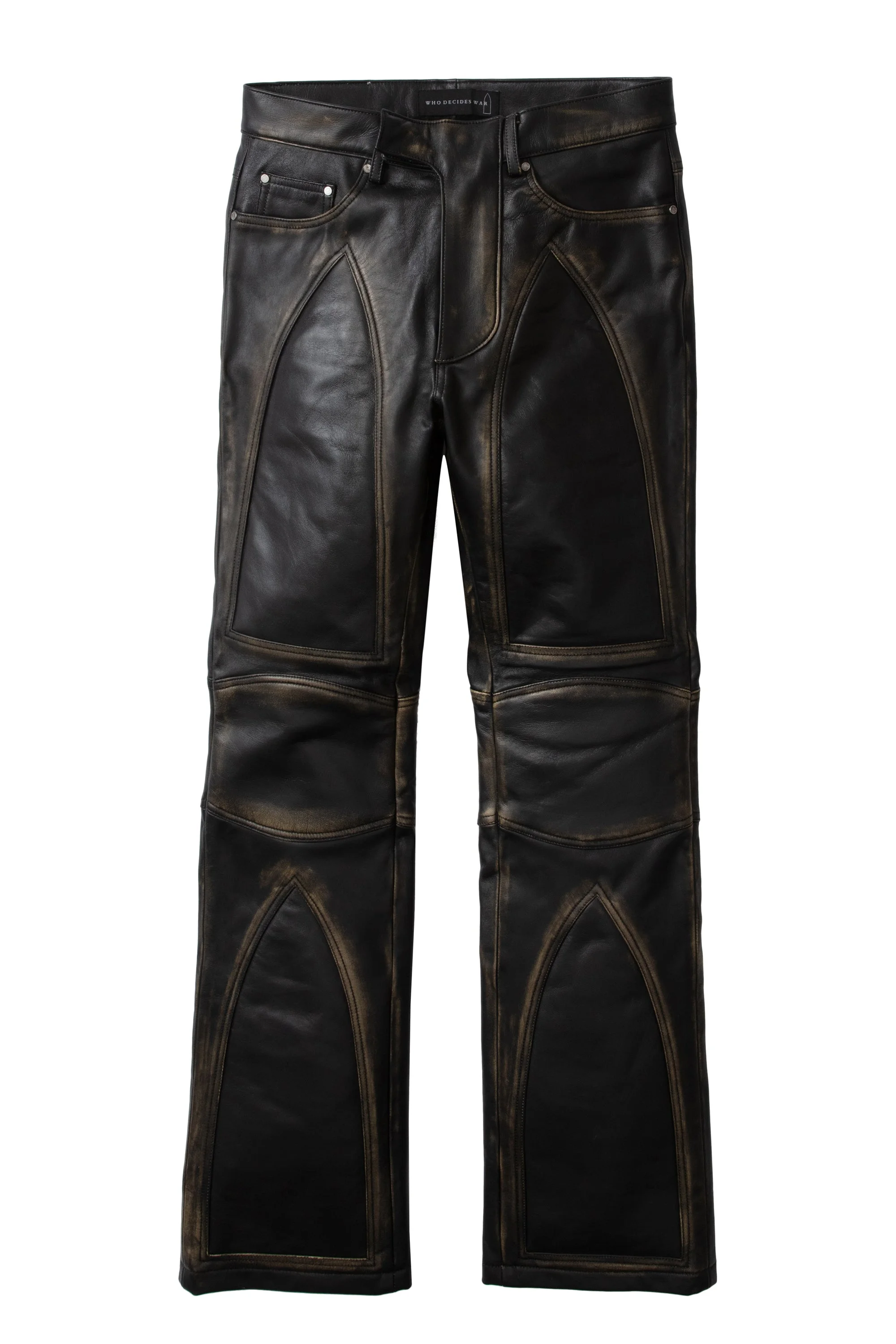 This Rub Off Leather Moto Pant is sure to become a part of your style. Made with 100% cowhide, these pants feature a slim straight fit with our new rub off leather technique. Our original stained glass motif is patterned on both the front and back of each leg, with reinforced knee panels. The branded jean buttons complete the look. Following your normal size is recommended. Processing takes 1-2 days, shipping in the US 3-4 days, internationally 7-10 days.