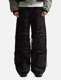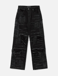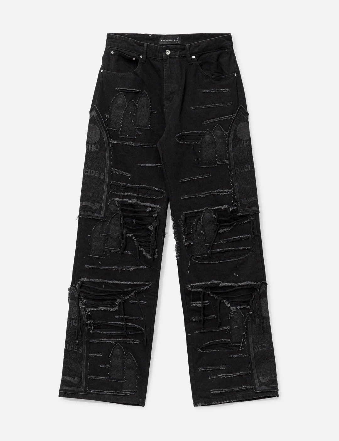 - Who Decides War - Ultra Flare Windowed Denim - Cotton denim pants - Zip fly - 5 pocket style - Distressing and stained glass embroidered patches throughout - Wide, flared cut - Color: Coal - Material: 100% Cotton - See more Jeans and Clothing