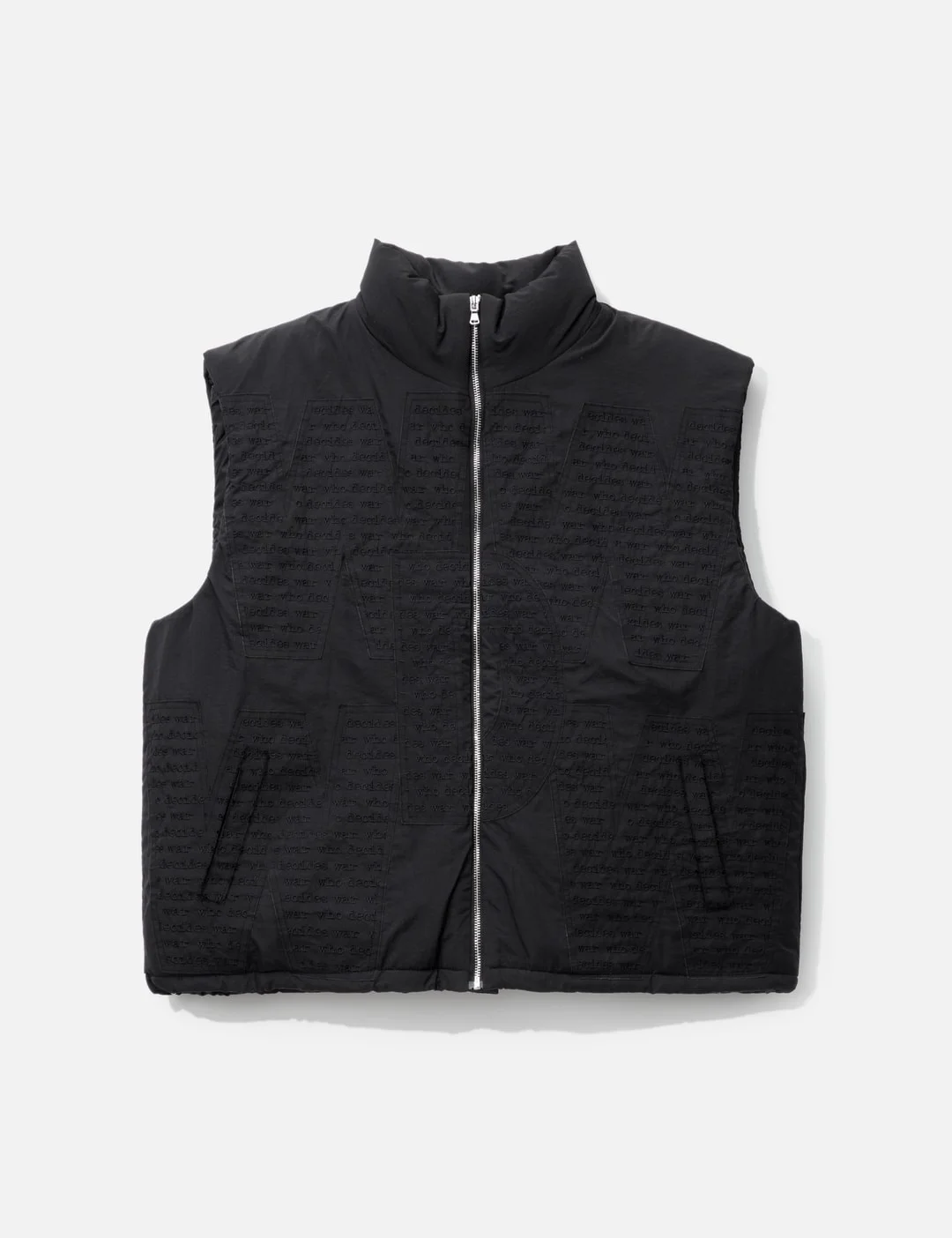 - Who Decides War - WDW Ski Vest - Stand collar - Zip closure - Tonal embroidered logo - Two front pockets - Adjustable hem - Color: Black - Material: 100% Nylon; Lining: 100% Polyester - See more Vests and Clothing SIZING - Model wears size M - Model measures: Height 189cm, Chest 31.5"/80cm, Waist 27”/69cm, Hip 34.3’’/87cm