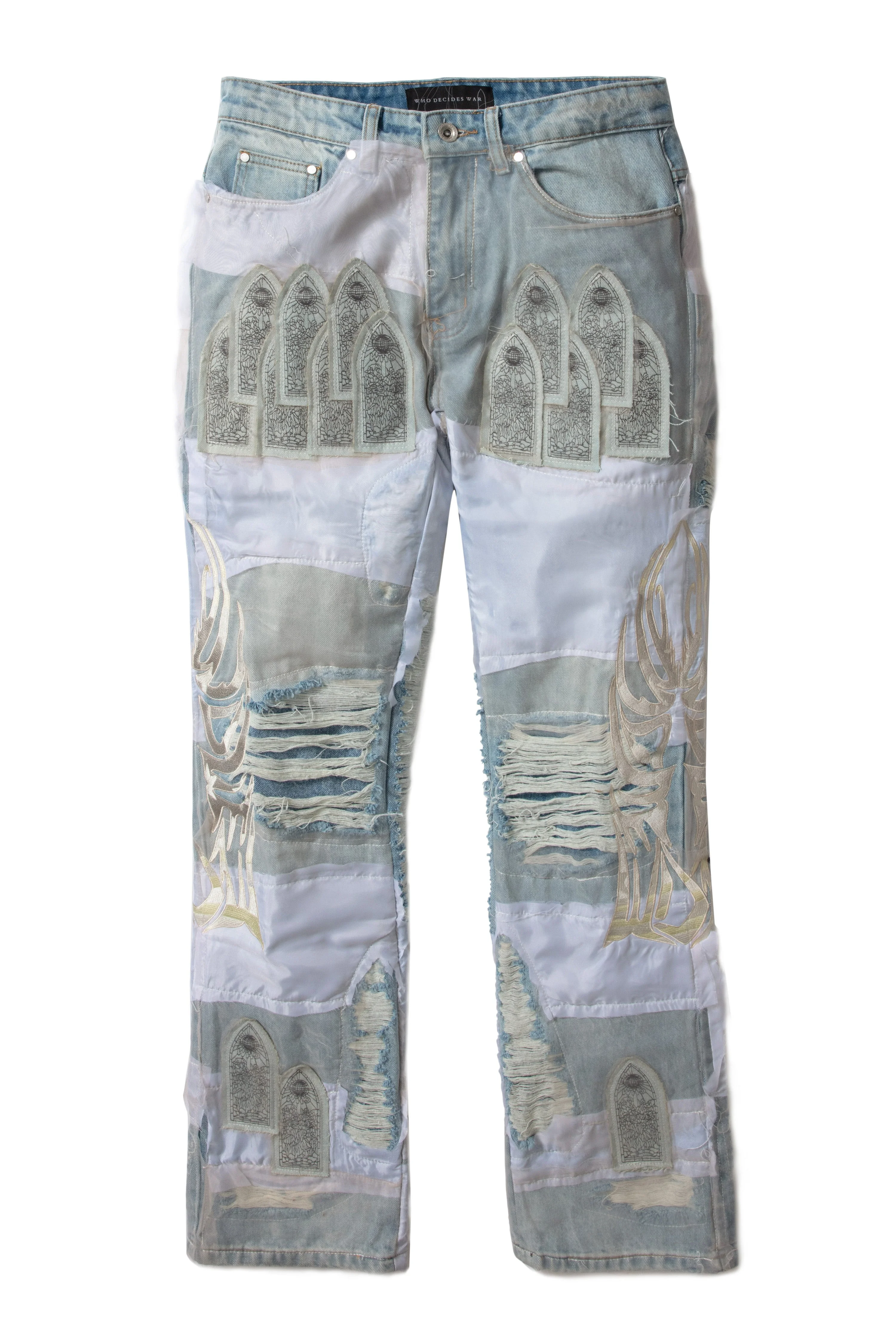 The WDW Winged Organza Denim are 100% cotton, a slightly flared fit, 35.5" inseam, with embroidered patches, lace, and distressing. Follow your normal size. Processing takes 1-2 days, shipping in the US 3-4 days, internationally 7-10 days.