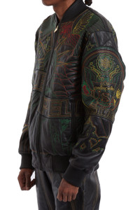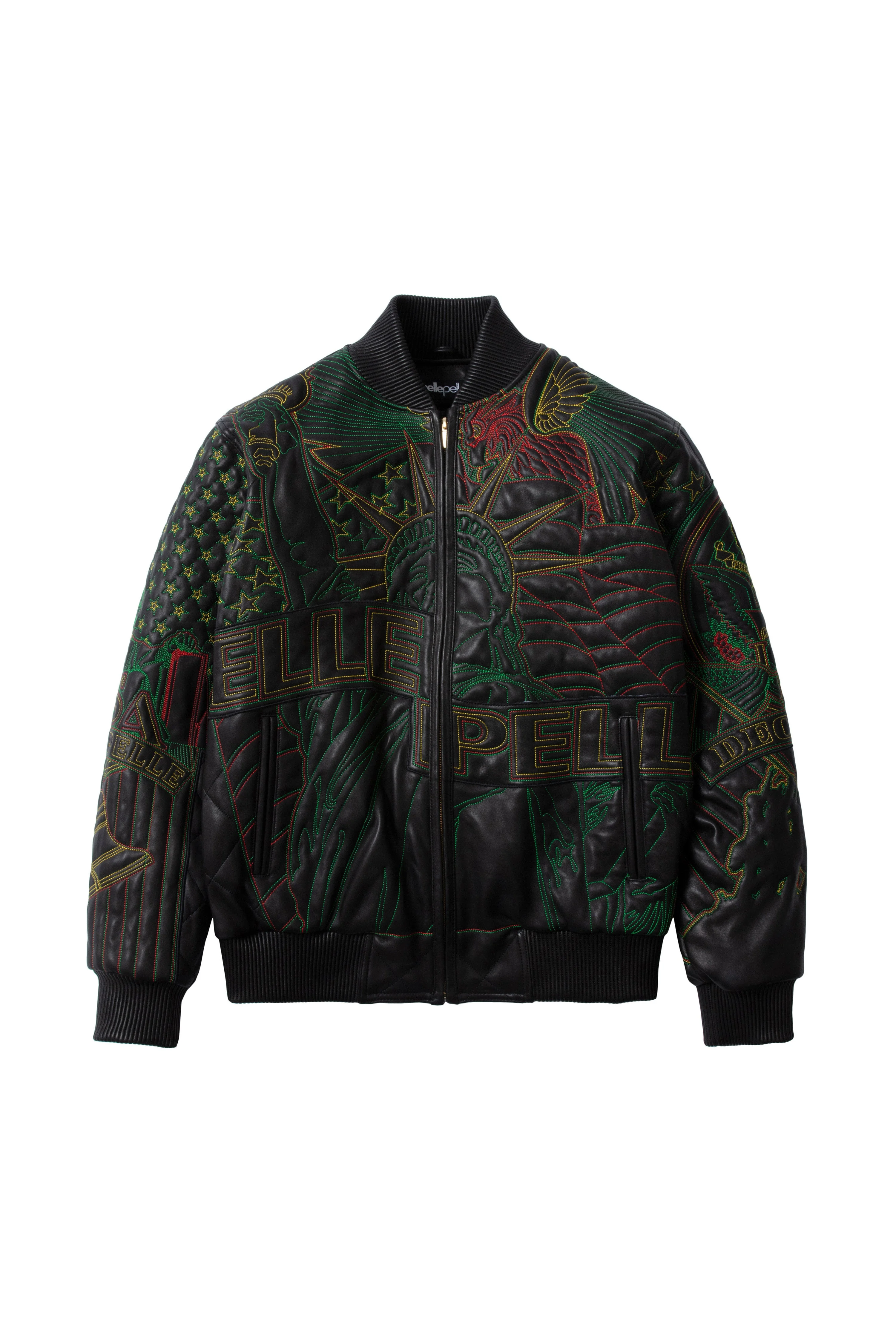 The WDW X PP MONUMENT JACKET features 100% genuine plush leather and a luxurious satin lining with outline direct embroidered "Pelle Pelle" branding. The jacket also includes multi-layered and oversized "Pelle Pelle X Who Decides War" leather applique artwork with direct embroidery at the back, interior pockets at the inside lining, waxed ribbed collar, and heavy 2x2 rib cuffs and hem with contrast color stripe tipping. Additionally, the contrast color leather front welt pockets and Pelle Pelle branded front zipper pull add a stylish touch to this expertly crafted jacket.