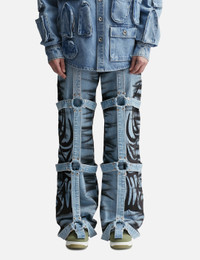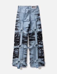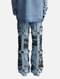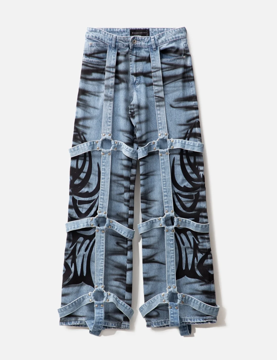 - Who Decides War - Winged Logo Bondage Pants - Oversized fit - Flared opening - Bondage details throughout - aAllover grafitti-like print - Zip fly, button closure - Five-pocket style - Color: Sky - Material: 100% Cotton - See more Jeans and Clothing SIZING - Model wears size 30 - Model measures: Height 187cm, Chest 36”/91cm, Waist 28”/72cm, Hip 36”/91cm