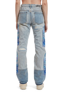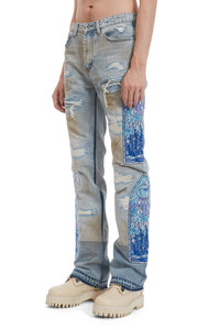 The Winter Mechanic Denim are comprised of 100% cotton and feature a slim straight fit. The pants feature an inseam of 35.5 inches and are embellished with patched distressing, accented darning and 2 stained glass patches on either leg with original artwork. The wash is to emulate a vintage worn and worked in effect. Follow your normal size. Processing takes 1-2 days, shipping in the US 3-4 days, internationally 7-10 days.