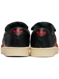 Low-top buffed leather sneakers. · Textured rubber trim at toe · Lace-up closure · Logo patch at extended foldover tongue · Padded collar · Signature serrated stripes and perforations at sides · Text embossed at outer side · Logo embossed at heel tab · Buffed leather lining · Treaded rubber sole Part of the Willy Chavarria x adidas Originals collaboration. Supplier color: Black/Red Upper: leather. Sole: rubber. Made in Indonesia 252232M237002