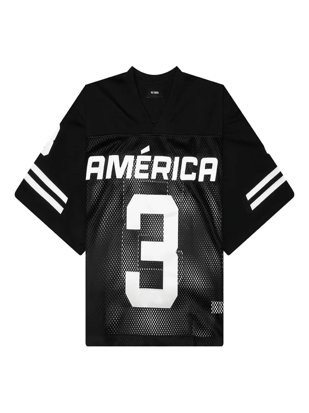 mesh-panel football jersey Highlights - Black - Mesh paneling - Lettering print - Number print - V-neck Made in United States Composition Polyester 100% Washing instructions Read Manufacturer Guidelines