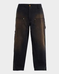 Combining utility with style, the Willy Chavarria "Workwear Toluca" pants feature a roomy cut and a washed finish that lends a rugged edge with tripleneedle topstitching throughout Drawstring waistband with branded aglets Side pockets; large back patch pockets Patch pockets on the back of the legs Double knee panel details Hammer loop on the side Tonal logo stitching and logo patch on the back leg Baggy fit with a slightly tapered hem Zip fly with single button closure Signature key loop belt loops Cotton Made in USA