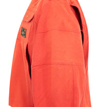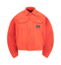 WILLY CHAVARRIA Stockton Work Jacket featuring an oversized fit, structured design, two chest flap pockets with button closures, full zip front with a high collar and embroidered logo detail on the front. 100% cotton canvas. Made in the USA. DESIGNER STYLE ID: WCJKT0033 COLOR: 006 RED
