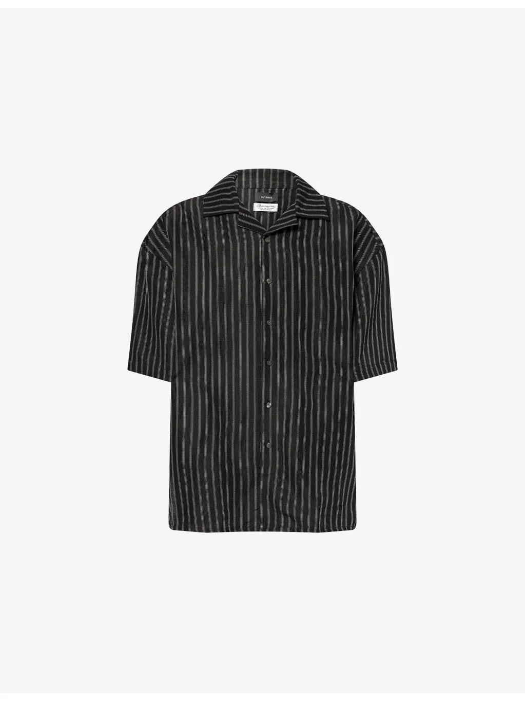 PRODUCT DETAILS - Willy Chavarria linen-blend shirt - 52% linen, 48% viscose - Exposed button fastenings at front - Relaxed fit, camp collar, short sleeves, two side slits, two loops at back, all-over stripe print - Dry clean only - Made in Portugal - Size medium: length 30in / 77cm, chest 50in / 127cm - Model is 6ft 2in/1.88m and wears a size medium - Lightweight, non-stretch Ref: R04616012