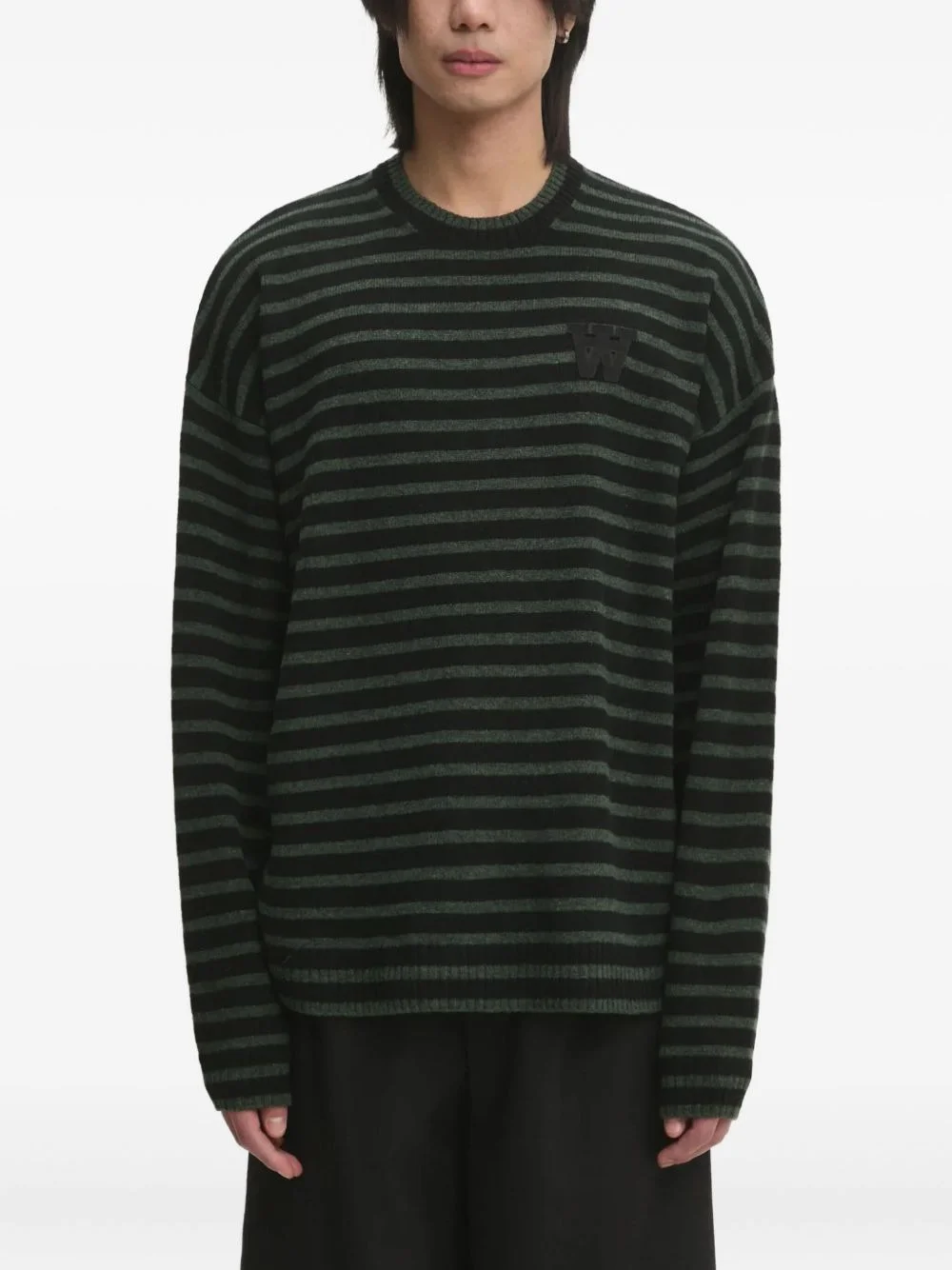 striped logo-patch jumper Highlights - Dark-green - Black stripes - Long sleeves - Crew neck - Wool - Logo patch Imported Composition Lambs Wool 100% Washing instructions Read Manufacturer Guidelines
