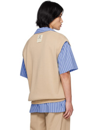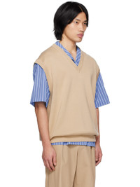 Knit wool vest. · Rib knit V-neck, hem, and armscyes · Embroidered logo patch at front hem · Leather logo patch at back collar Supplier color: Beige 100% wool. Made in South Korea 231704M206000