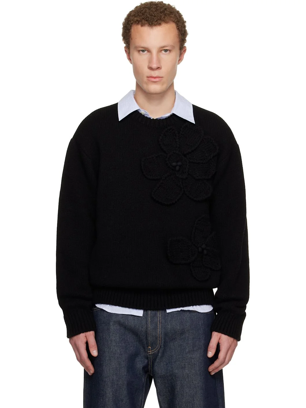 Knit wool sweater. · Rib-knit crewneck, hem, and cuffs · Crocheted floral appliques at front · Logo hardware at back collar Supplier color: Black 100% wool. Made in South Korea 252704M201002