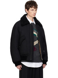 Down-filled wool-blend tweed jacket. · Herringbone pattern throughout · Pin-buckle throat guard at fleece spread collar · Zip closure · Flap pockets at front · Logo hardware at front and back collar · Rib-knit hem and cuffs · Welt pockets at interior · Full satin lining Supplier color: Black Body: 70% polyester, 30% wool. Trim 1: 100% merino wool. Trim 2: 65% viscose, 35% nylon. Fill 1: 90% goose down, 10% goose feather. Fill 2: 100% polyester. Lining: 100% polyester. Made in South Korea 252704M178001
