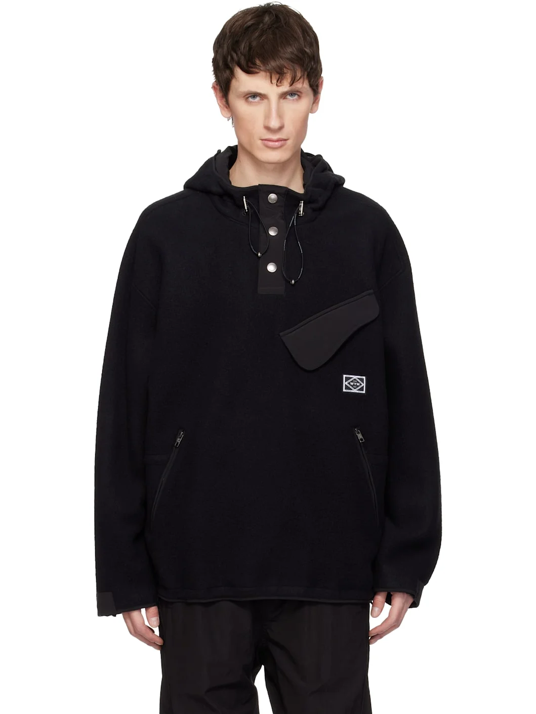 Wool-blend fleece hoodie. · Bungee-style drawstring at hood · Stand collar · Press-stud placket · Flap pocket and logo patch at chest · Zip pockets at front · Bungee-style drawstring at hem and back · Elasticized loop at cuffs · Logo hardware at back collar Supplier color: Black Body: 74% wool, 26% polyester. Trim: 100% polyester. Made in South Korea 252704M202011