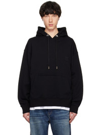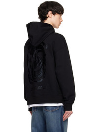 French terry hoodie. · Drawstring at hood · Embroidered logo patch at chest · Kangaroo pocket · Rib-knit hem and cuffs · Dropped shoulders · Logo hardware at back collar · Graphic and text printed at back · Logo-engraved silver-tone hardware Supplier color: Black Body: 100% cotton. Trim: 92% cotton, 6% polyester, 2% spandex. Made in South Korea 242704M202007