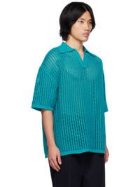 Open knit polo. · Open spread collar · Rib knit hem and cuffs · Logo hardware at back collar Supplier color: Blue 100% polypropylene. Made in South Korea 231704M212005